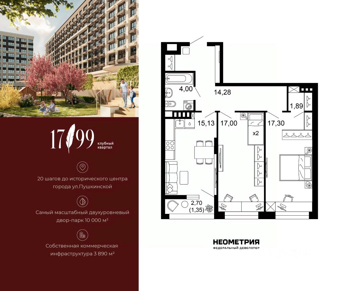 Продается квартира в клубном квартале "1799". Это истинный бизнес-класс в историческом центре Ростова. Особое сочетание уникальной локации и среды, где хочется создавать ту жизнь, которая подходит вам. Где каждое мгновение становится частью семейной коллекции лучших моментов. Квартал вдохновлен идеями великих и создан для великих. Образ хранителя ценностей — в каждой детали: имя и философия замедления, аристократичные фасады, лобби и холлы, семейные резиденции-истории и актуальное содержание. На приватной территории в 2,5 гектара четыре дома всего 10-этажей образуют масштабный двухуровневый двор-парк 10 000 м2 со smart-зонированием по возрастам и интересам. Среда квартала продумана для всей семьи: учебы и работы, спорта и отдыха, совместного досуга и теплых бесед. Гамак мечтателя, тайные места и маршруты, вертикальный сад пряных трав, амфитеатр и даже новогодняя ель. Резидентам доступны редкие для центра привилегии — природная тишина и свобода быть собой. Безукоризненный сервис и собственная коммерческая инфраструктура 3 890 м2, где все необходимое под рукой, позволяют жить в центре с бескомпромиссным комфортом.