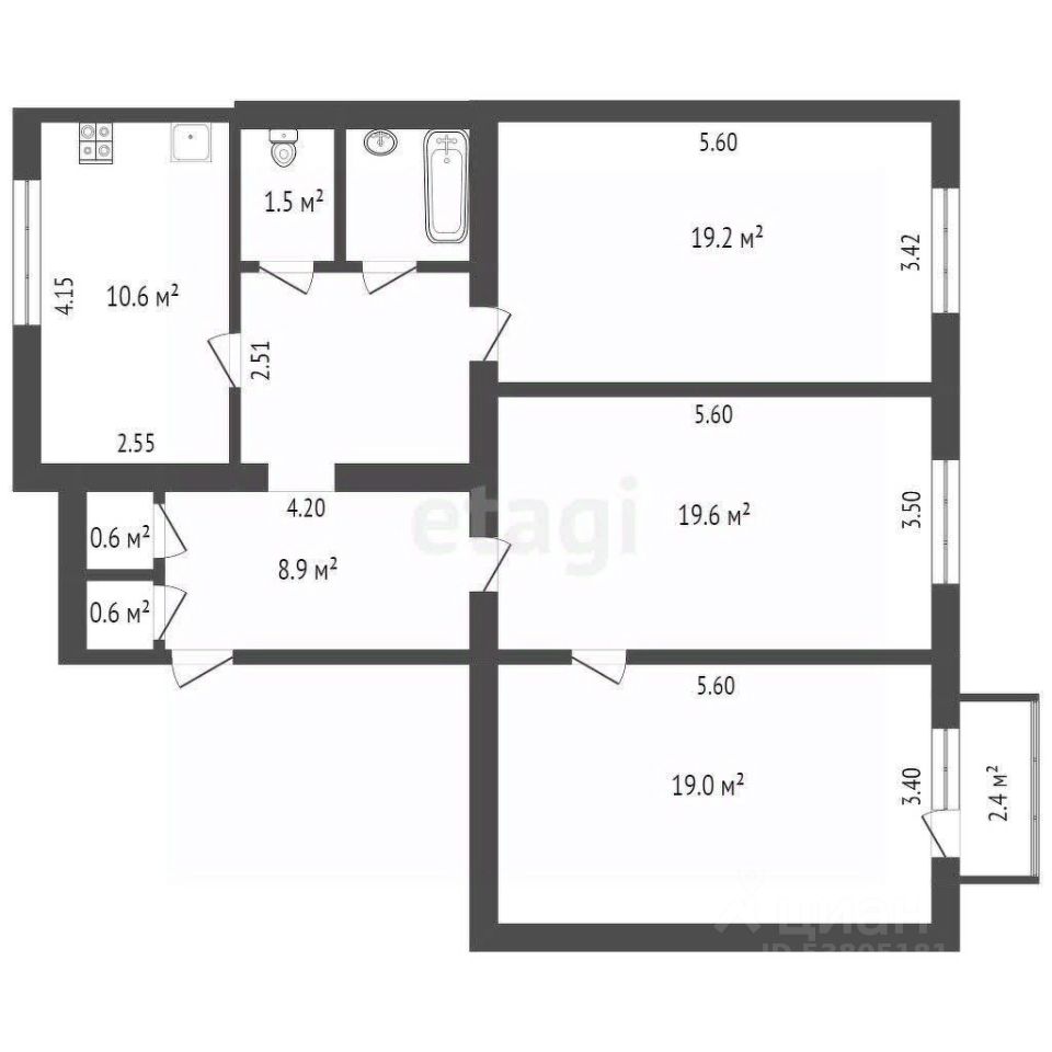 Ключевое преимущество — значительные площади помещений: три изолированные комнаты по 19 кв. м. каждая, что обеспечивает комфорт для большой семьи или возможности для организации личного пространства. В комнатах уложен паркет, в прихожей и коридоре — ламинат, в кухне — практичный линолеум.