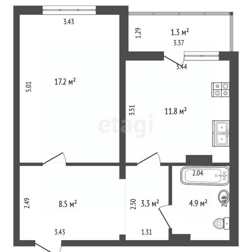 Большая кухня (11,8 м²): Настоящее сердце квартиры, где легко поместится обеденный стол для семьи и друзей.