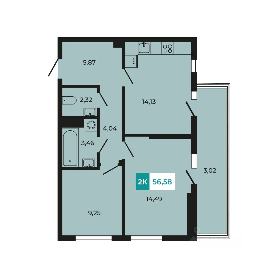 В продаже 2- комнатная квартира площадью 56,58 кв м на 1 этаже от застройщика.