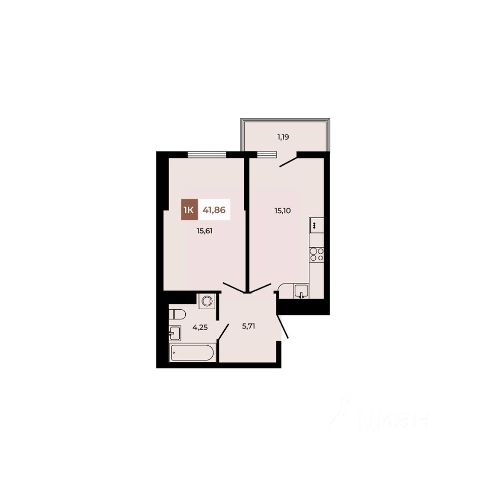 В продаже 1 -комнатная квартира площадью 41,86 кв м на 6 этаже от застройщика.