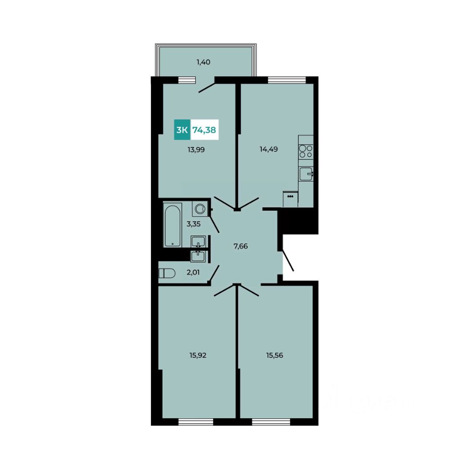 В продаже 3 - комнатная квартира площадью 74,38 кв м на 7 этаже от застройщика.