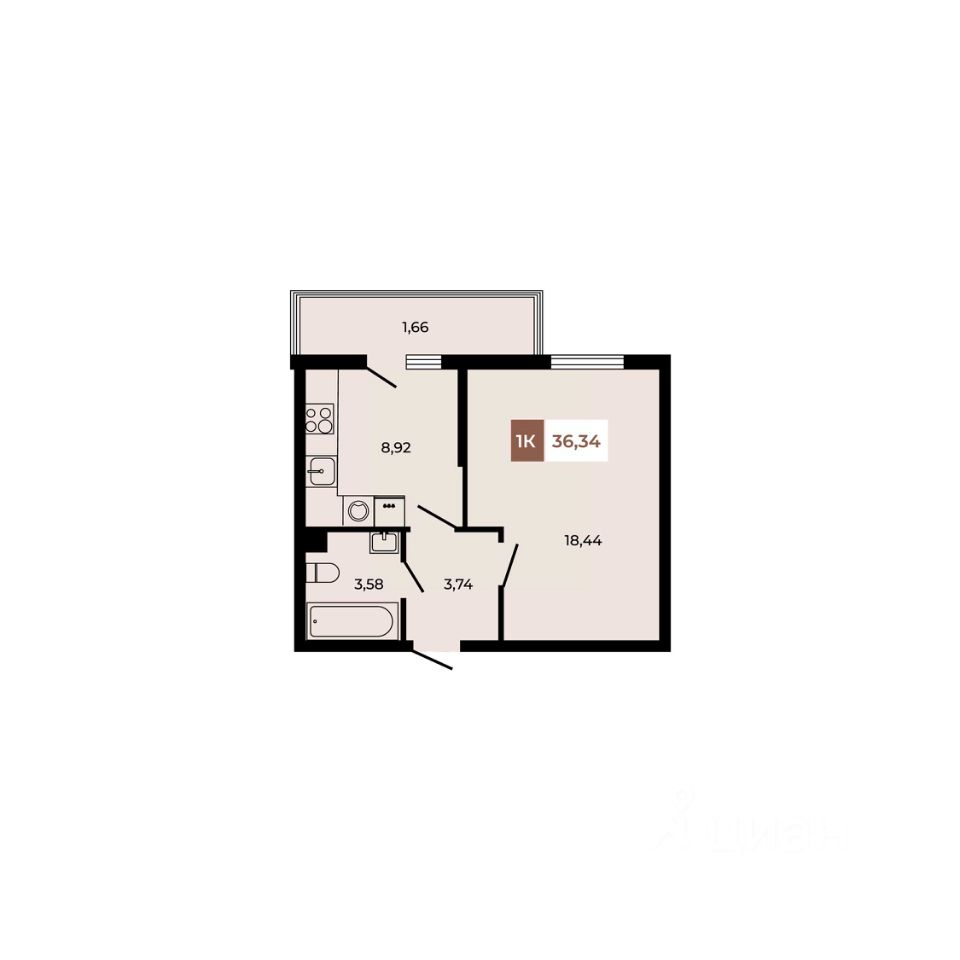 В продаже 1 - комнатная квартира площадью 36,34 кв м на 2 этаже от застройщика.