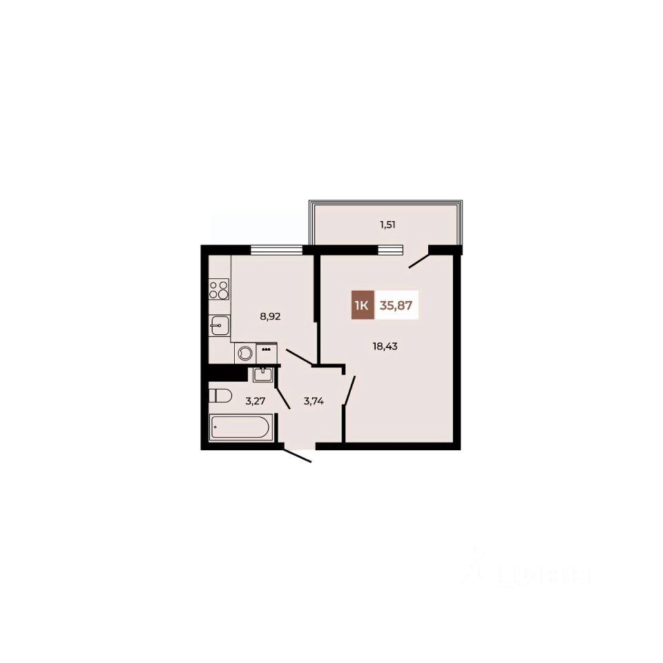 В продаже 1 - комнатная квартира площадью 35,87 кв м на 3 этаже от застройщика.