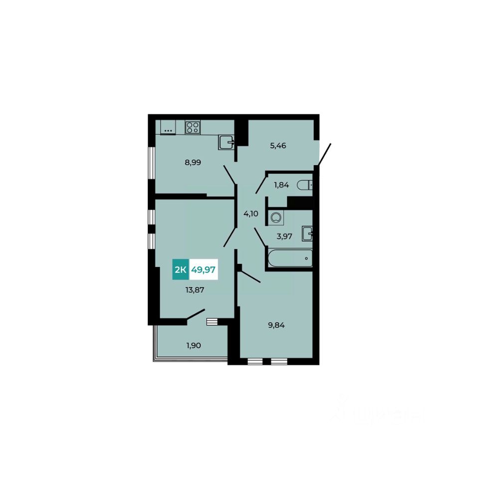 В продаже 2 - комнатная квартира площадью 49,97 кв м на 6 этаже от застройщика.