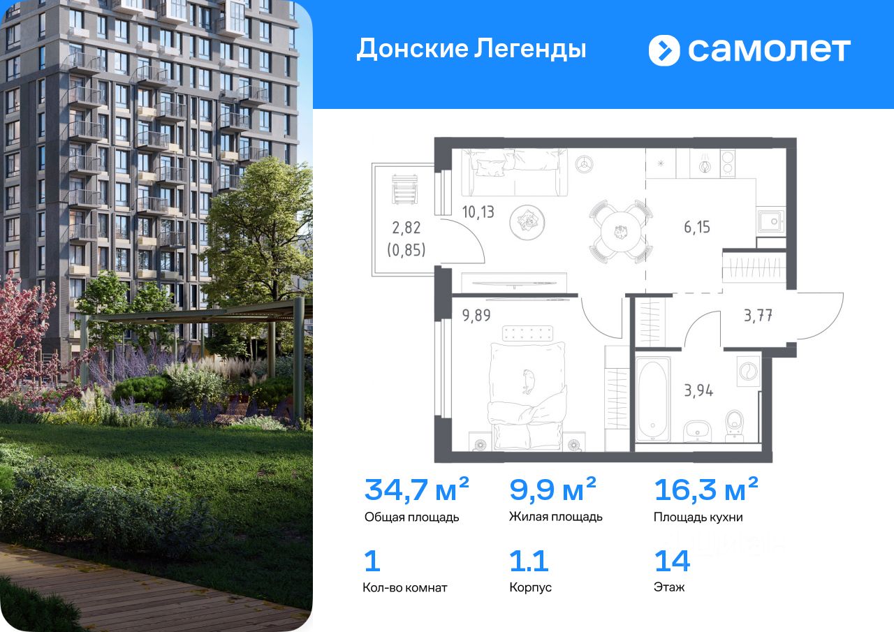 Строим кварталы для жизни с заботой о будущем. Предлагается 1-комнатная квартира комфорт-класса 34,73 кв.м в корпусе 1.1 на 14 этаже, в ЖК "Донские Легенды"