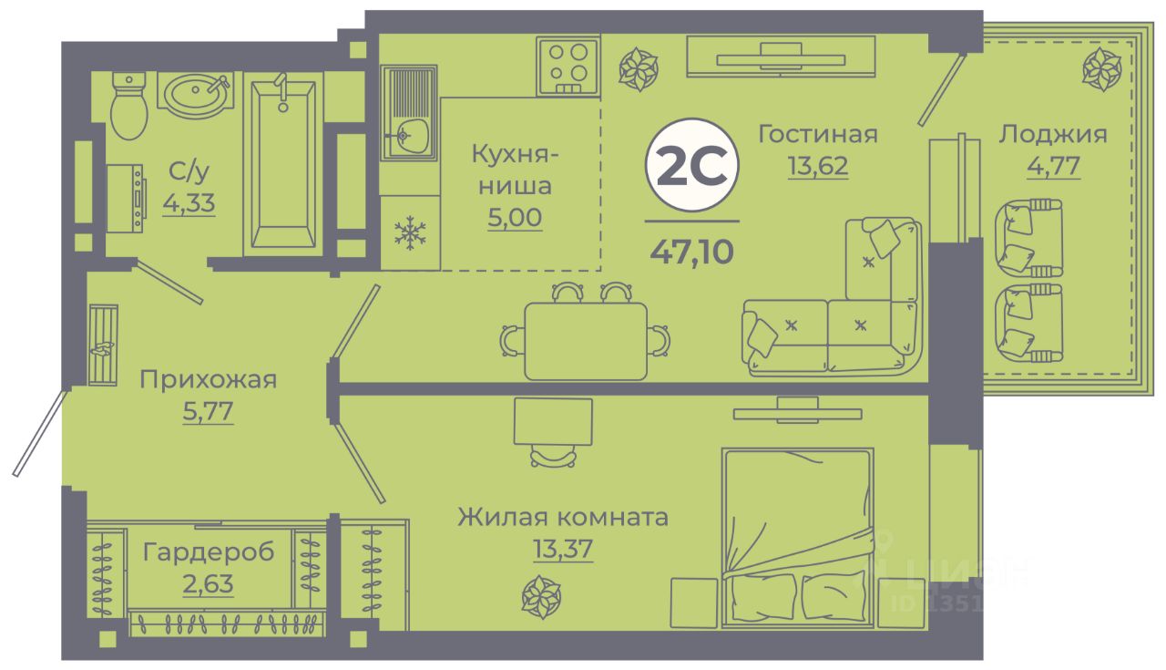Общая площадь46,97 м²