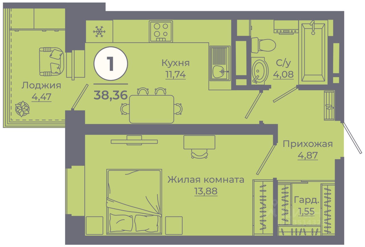 Общая площадь38,07 м²
