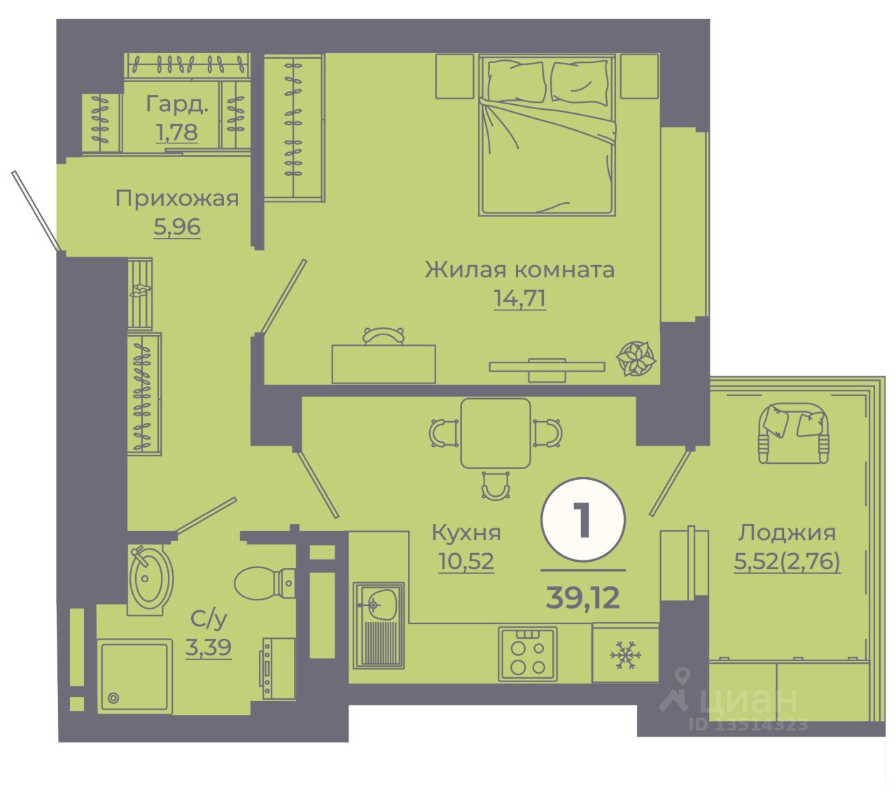 Общая площадь39,08 м²