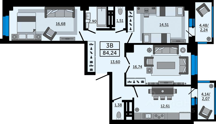 Продаётся 3-комнатная квартира в строящемся доме (Дом 3), срок сдачи: IV-кв. 2028, общей площадью 84.24 кв.м., на 22 этаже. Новый жилой комплекс "Four Premieres" от компании "Московская строительная компания" расположен по адресу г. Ростов-на-Дону по ул. Мечникова.