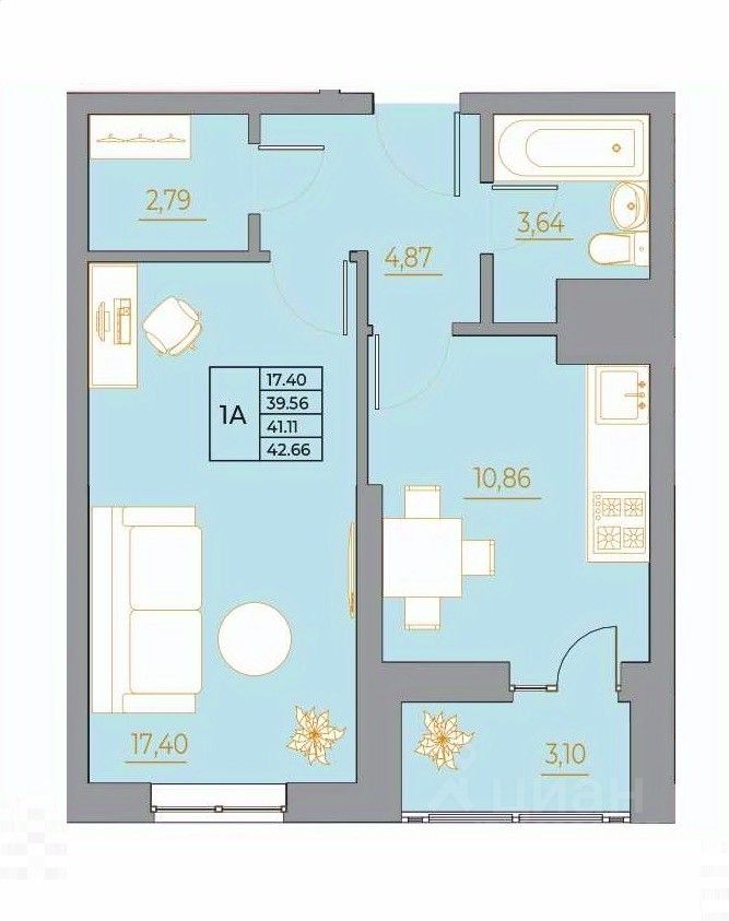 •1 изолированная спальня 17 кв. м