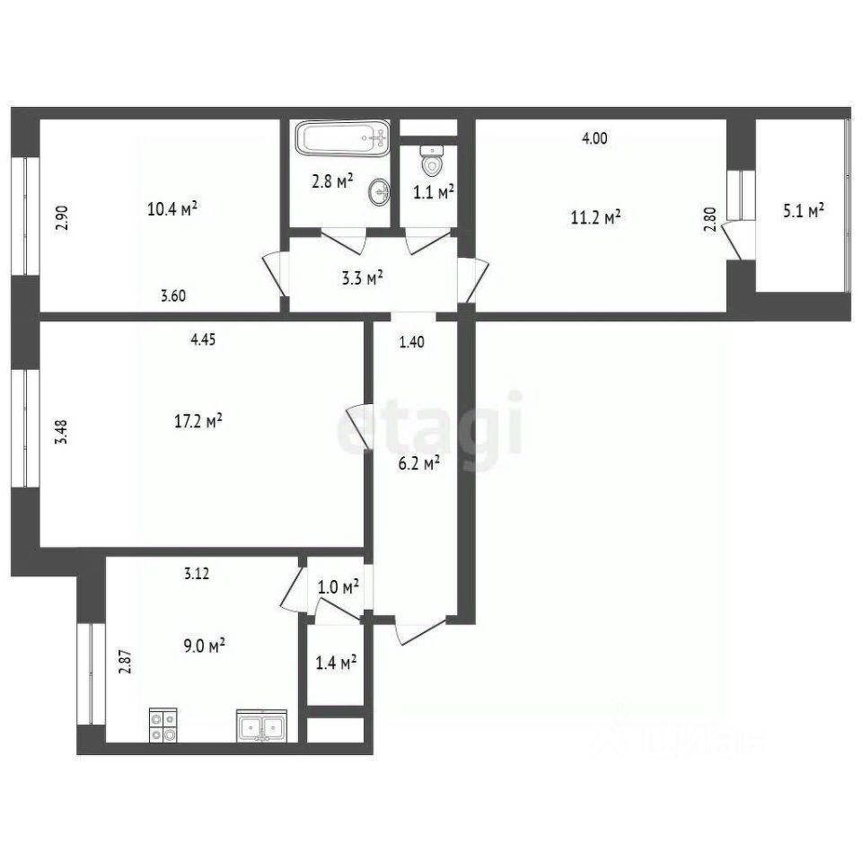 * Просторная кухня площадью 9,5 м² — отличное место для кулинарных шедевров.