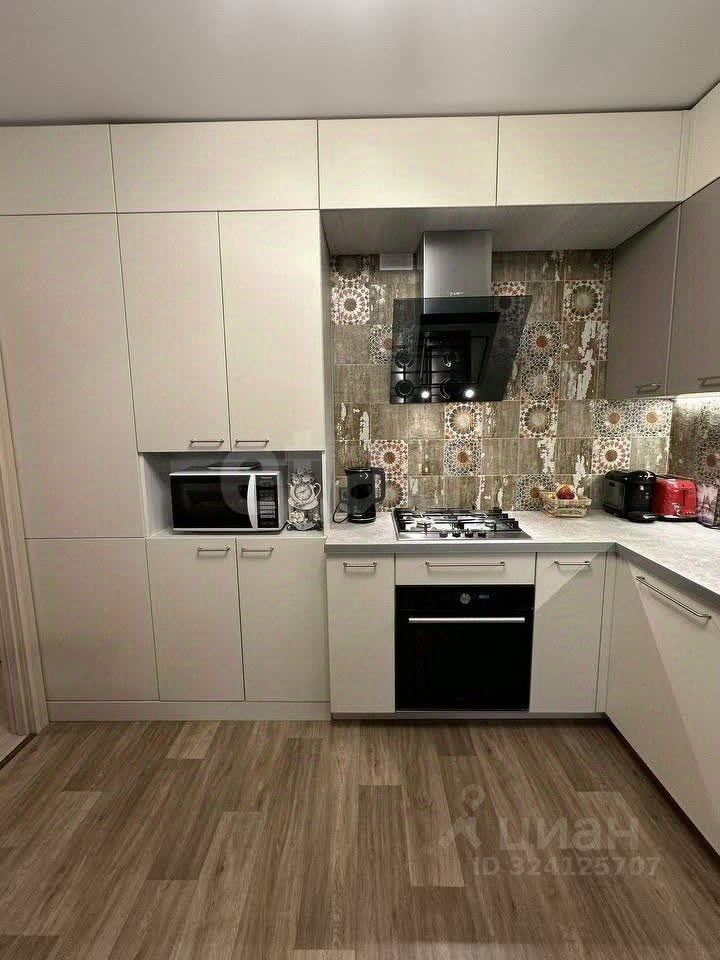 В квартире остаются качественные элементы отделки и встроенная техника: трехуровневая кухня с фартуком, фурнитурой Blum, варочной панелью, вытяжкой и духовым шкафом.