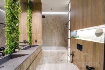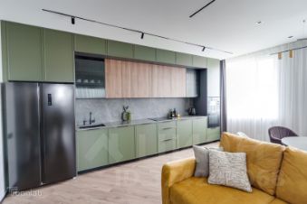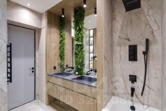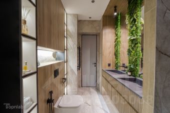 Авторский интерьер в элегантной палитре: натуральное дерево, благородный камень и уютные зелёные акценты. Каждая деталь создаёт гармонию современного комфорта.