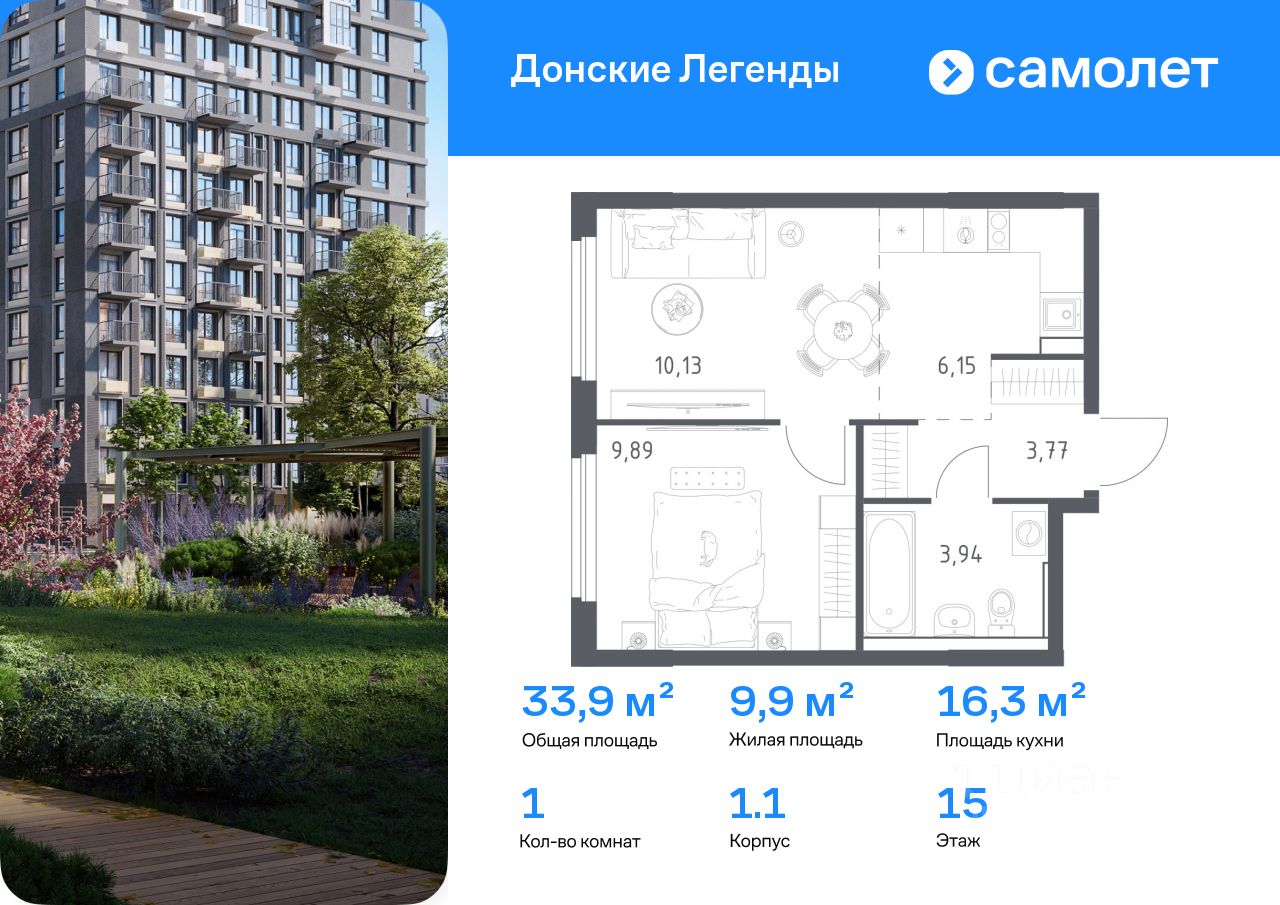 Строим кварталы для жизни с заботой о будущем. Предлагается 1-комнатная квартира комфорт-класса 33,88 кв.м в корпусе 1.1 на 15 этаже, в ЖК "Донские Легенды"