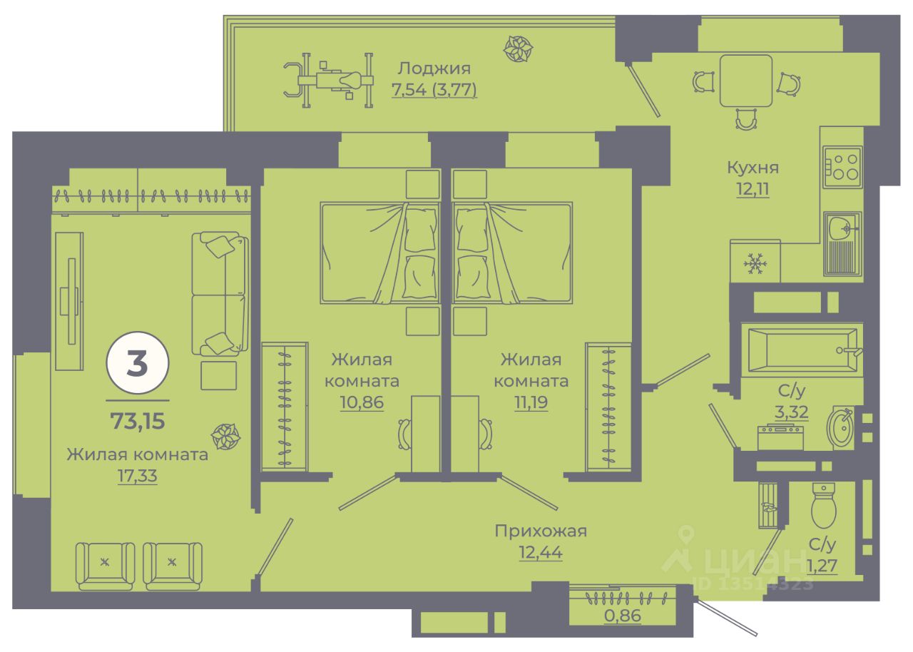 Общая площадь72,74 м²