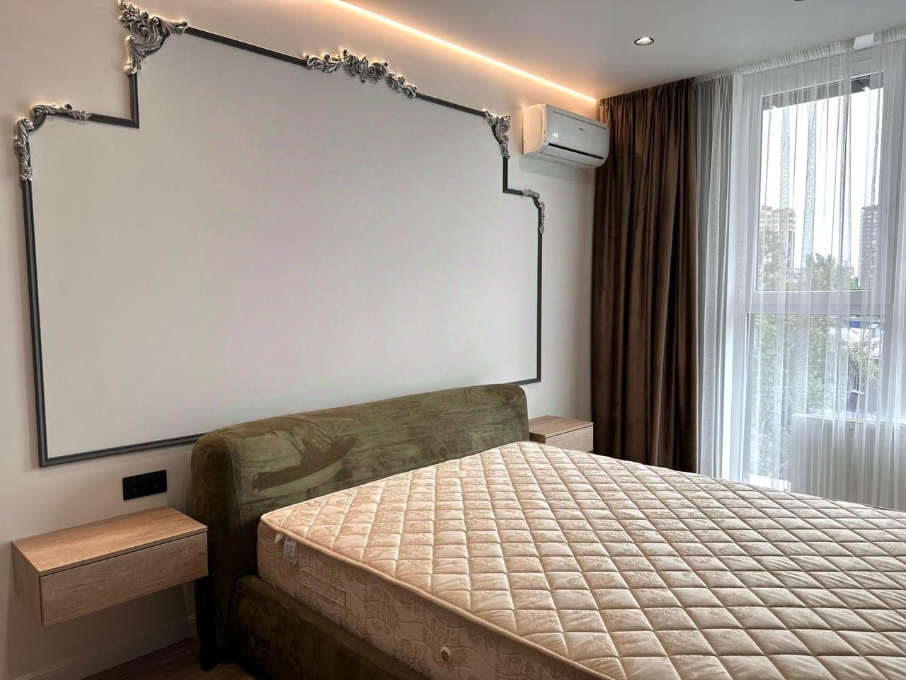 Просторная кровать с удобным матрасом и стильным изголовьем в благородном зелёном оттенке — зона абсолютного релакса.