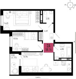 Продаётся 2-комнатная квартира в строящемся доме (Литер 1.1), срок сдачи: IV-кв. 2026, общей площадью 58.14 кв.м., на 7 этаже.