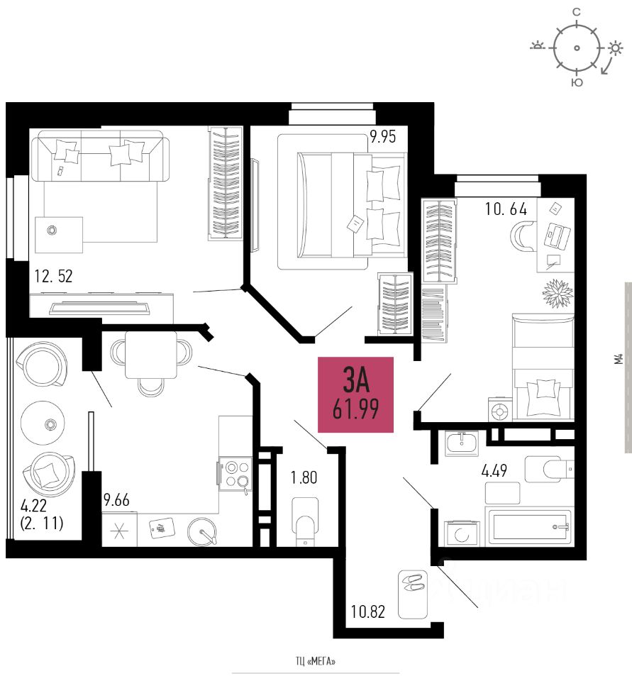 Продаётся 3-комнатная квартира в строящемся доме (Литер 11.4), срок сдачи: II-кв. 2028, общей площадью 61.99 кв.м., на 3 этаже.