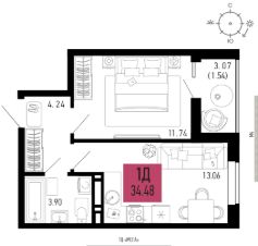 Продаётся 1-комнатная квартира в строящемся доме (Литер 3.1), срок сдачи: II-кв. 2028, общей площадью 34.48 кв.м., на 2 этаже.