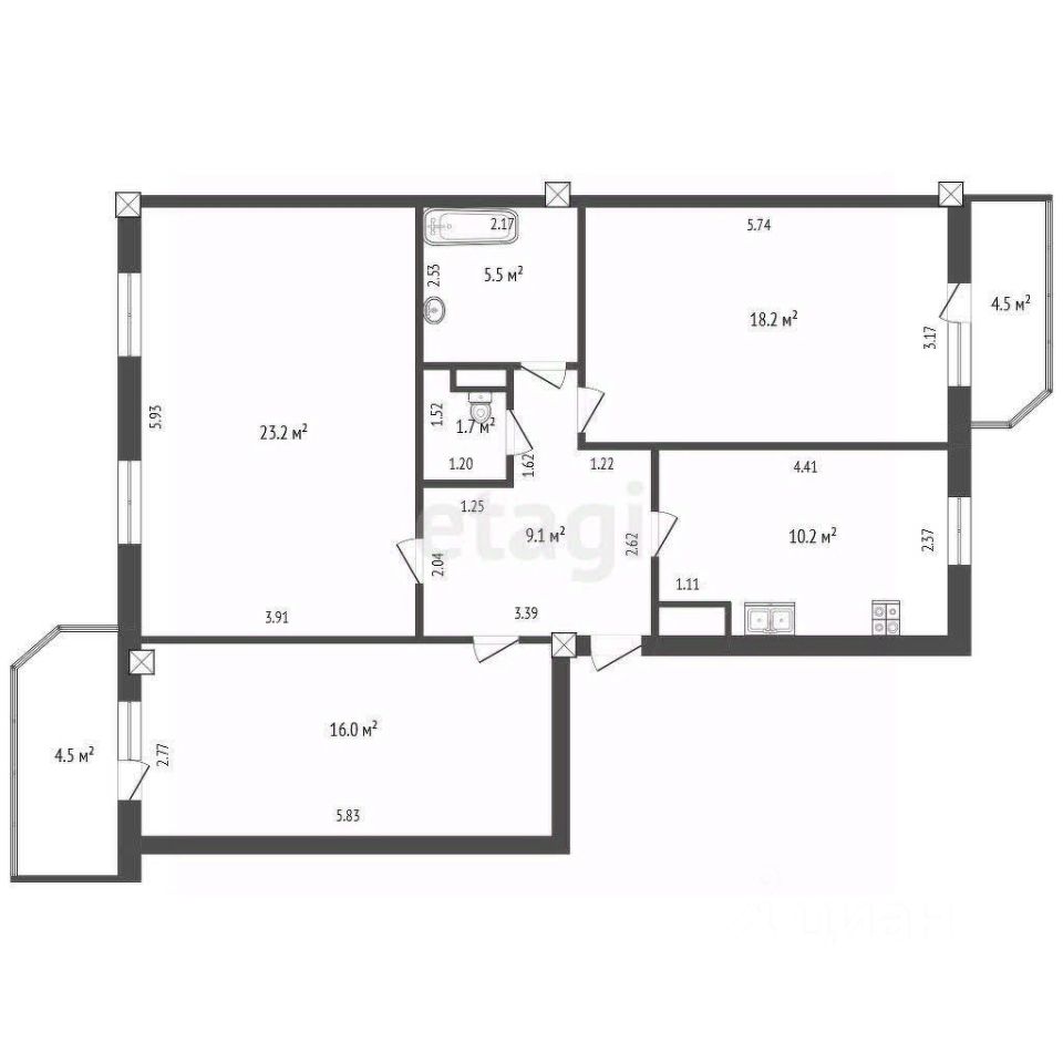 две лоджии по 4,5 кВ.м (одна выходит на север, другая на юг)