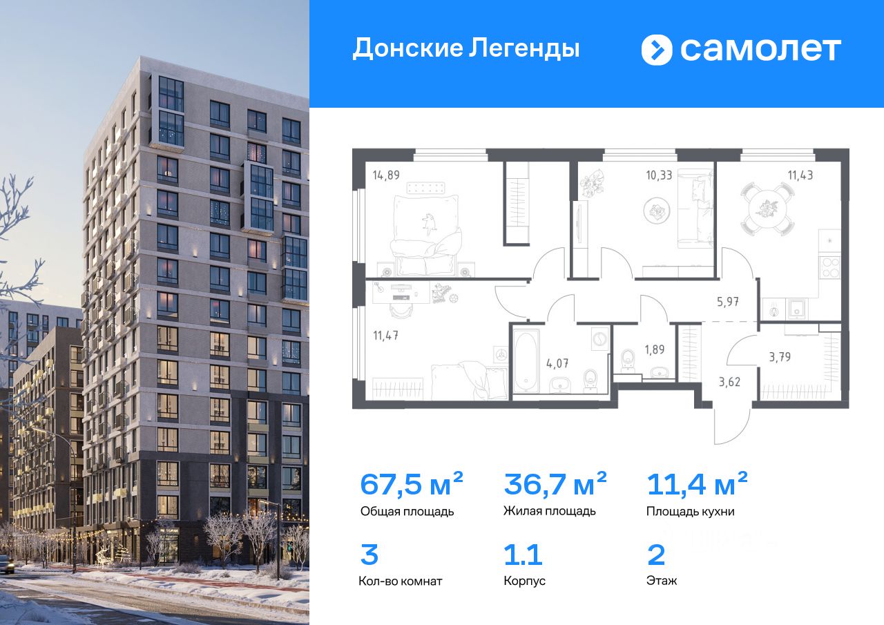Строим кварталы для жизни с заботой о будущем. Предлагается 3-комнатная квартира комфорт-класса 67,46 кв.м в корпусе 1.1 на 2 этаже, в ЖК "Донские Легенды"