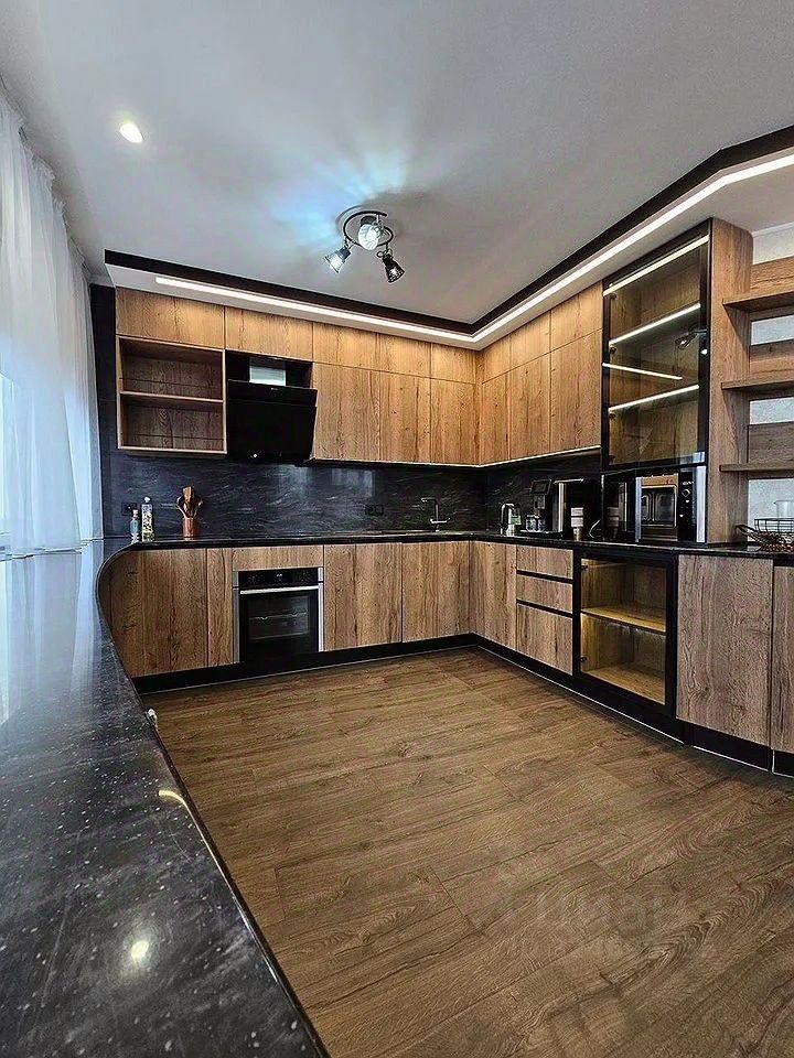 Кухня со встроенной техникой nеff(духовой шкаф, плита, вытяжка, микроволновая печь и посудомоечная машина).