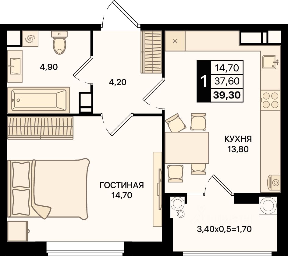 Общая площадь39,3 м²