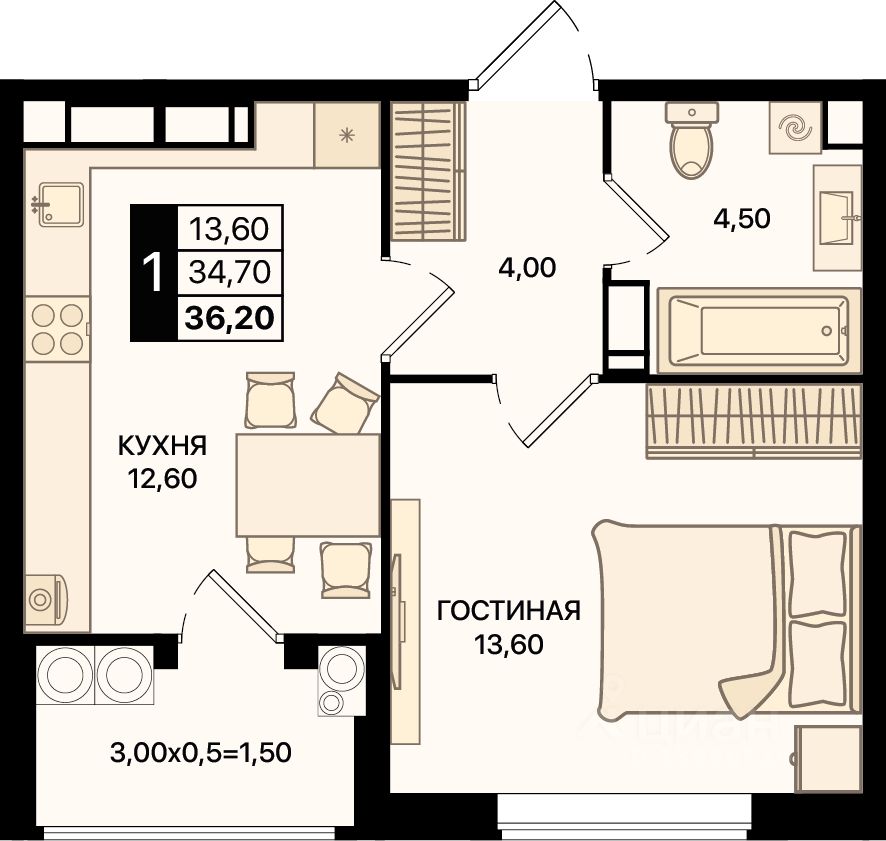 Общая площадь36,2 м²