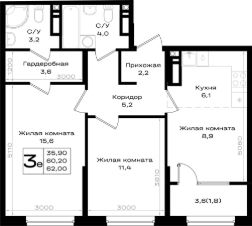 Продаётся 3-комнатная квартира в строящемся доме (Литер 3.1), срок сдачи: II-кв. 2028, общей площадью 62 кв.м., на 18 этаже.