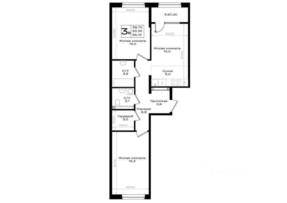 Продаётся 3-комнатная квартира в строящемся доме (Литер 3.2), срок сдачи: II-кв. 2028, общей площадью 65.1 кв.м., на 2 этаже.