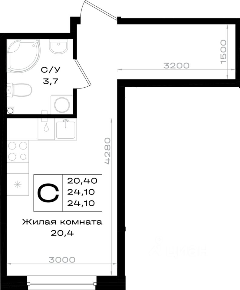 Продаётся 1-комнатная квартира в строящемся доме (Литер 3.2), срок сдачи: II-кв. 2028, общей площадью 24.1 кв.м., на 2 этаже.