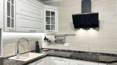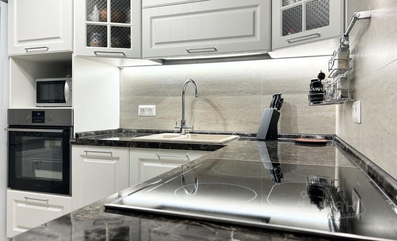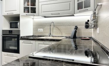 Кухня производства фирмы МАРИЯ, оборудована индукционной плитой, духовым шкафом, посудомоечной машиной. Фартук выполнен из керамогранита.