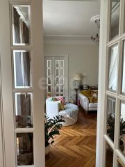 Продуманная планировка включает четыре просторные комнаты и дополнительный кабинет (бывшая комната прислуги), который идеально подойдет под гардеробную. Интерьер выполнен в классическом стиле с элементами дореволюционной архитектуры: организованы центральная и боковая анфилады, обеспечено удобное круговое перемещение по квартире.