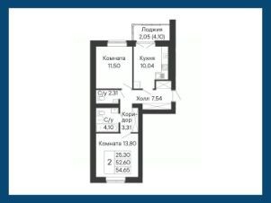 Планировочное решение этой двухкомнатной квартиры включает изолированные комнаты, два санузла и выход на лоджию из кухни.