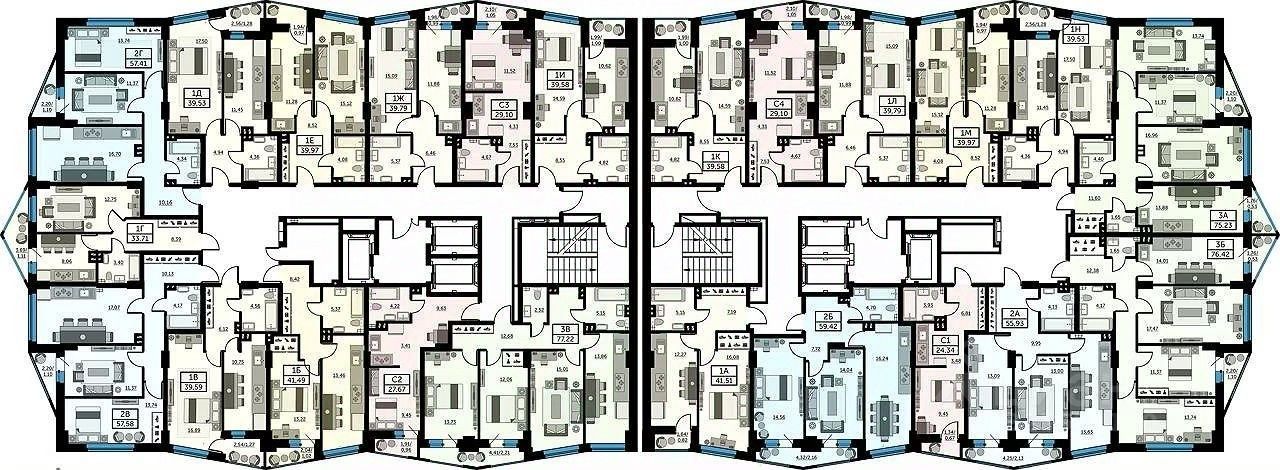Высота потолков составляет 2.7 метра, окна — панорамные и увеличенные.