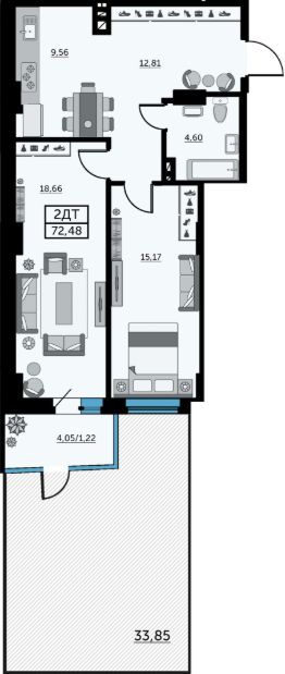 В продаже двухкомнатная квартира в новостройке. Лучшее решение для жизни, под сдачу или для инвестиций. Данная планировка - это двухкомнатная квартира евроформата и современное решение для тех, кто ценит функциональность пространства. Здесь есть всё для ваших идей и потребностей: универсальные по размеру комнаты, большая прихожая и собственная терраса. Успейте забронировать квартиру напрямую от застройщика.