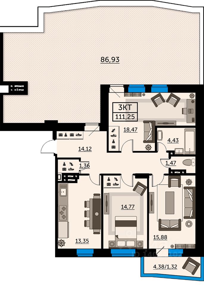 В продаже трехкомнатная квартира в новостройке. Лучшее решение для жизни, под сдачу или для инвестиций. Это светлая квартира-бабочка, со множество окон уютным балконом с одной стороны и с большой террасой с другой. В просторной прихожей также есть кладовая, которую можно использовать как зону для хранения. Благодаря продуманному расположению комнат и другим преимуществам здесь будет комфортно всей семье Самые выгодные предложения на этапе строительства. Успейте приобрести квартиру от застройщика по доступной цене.