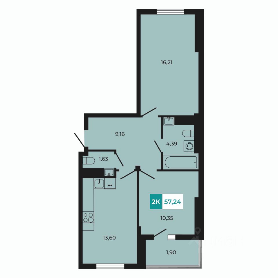В продаже 2 - комнатная квартира площадью 57,24 кв м на 8 этаже от застройщика.