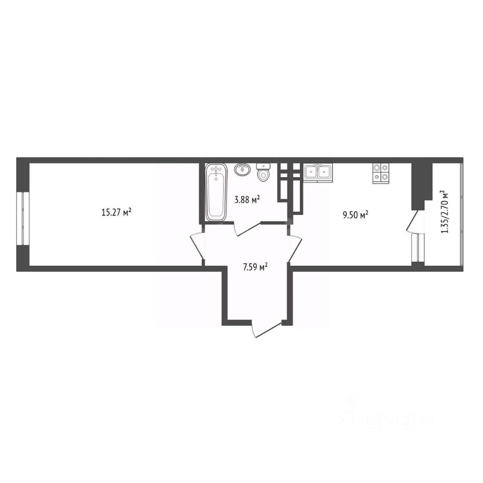Квартира отличается рациональной планировкой "бабочка", которая четко разделяет кухню и гостевую зоны. Просторная спальня площадью 15.27 кв. м, кухня в 9.5 кв. м, создает комфортное пространство для жизни. Удобная прихожая в 7.59 кв. м и санузел 3.88 кв. м завершают функциональную планировку.