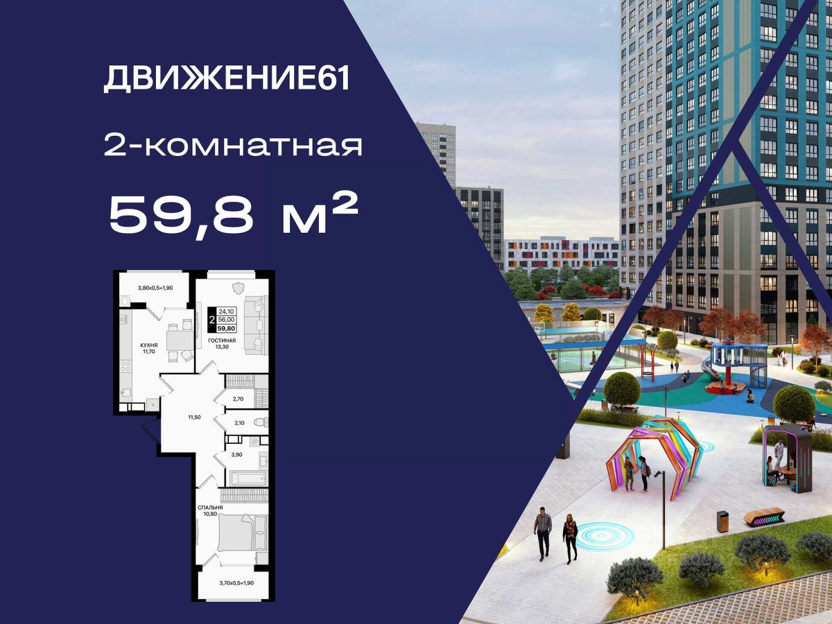 Продается комфортная 2-комнатная квартира в новом масштабном проекте "Движение61" от надежного федерального застройщика ЮгСтройИнвест — лидера юга России с более чем 20-летней историей.