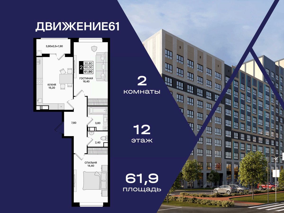 Продается комфортная 2-комнатная квартира в новом масштабном проекте "Движение61" от надежного федерального застройщика ЮгСтройИнвест — лидера юга России с более чем 20-летней историей.