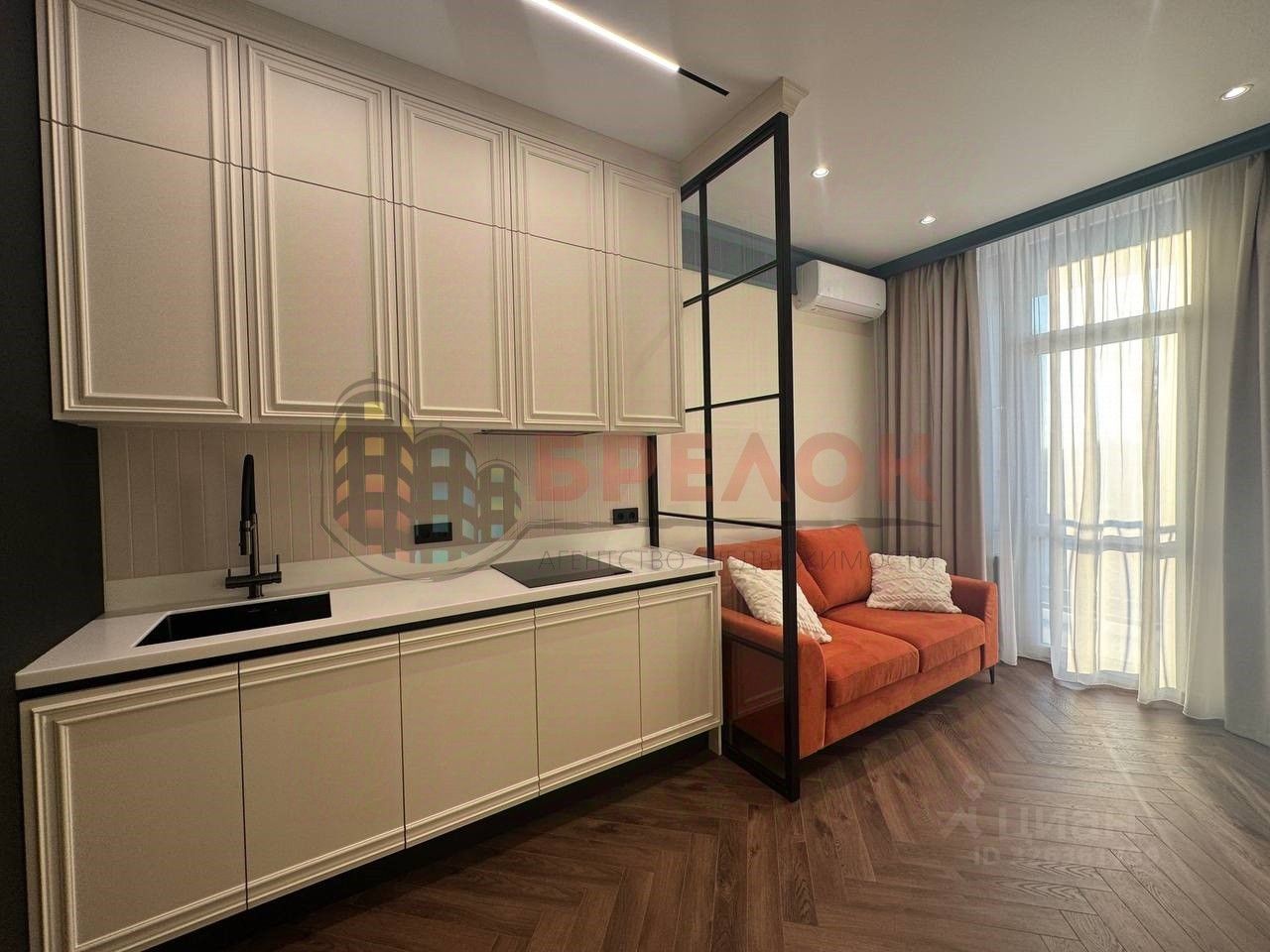 Кухня выполнена на заказ по индивидуальному проекту с резными фасадами и большим количеством мест хранения, установлена вся встроенная техника (холодильник, СВЧ, духовой шкаф и посудомоечная машина) . Зона гостинной оборудована удобным диваном и TV зоной имеет выход на просторный балкон