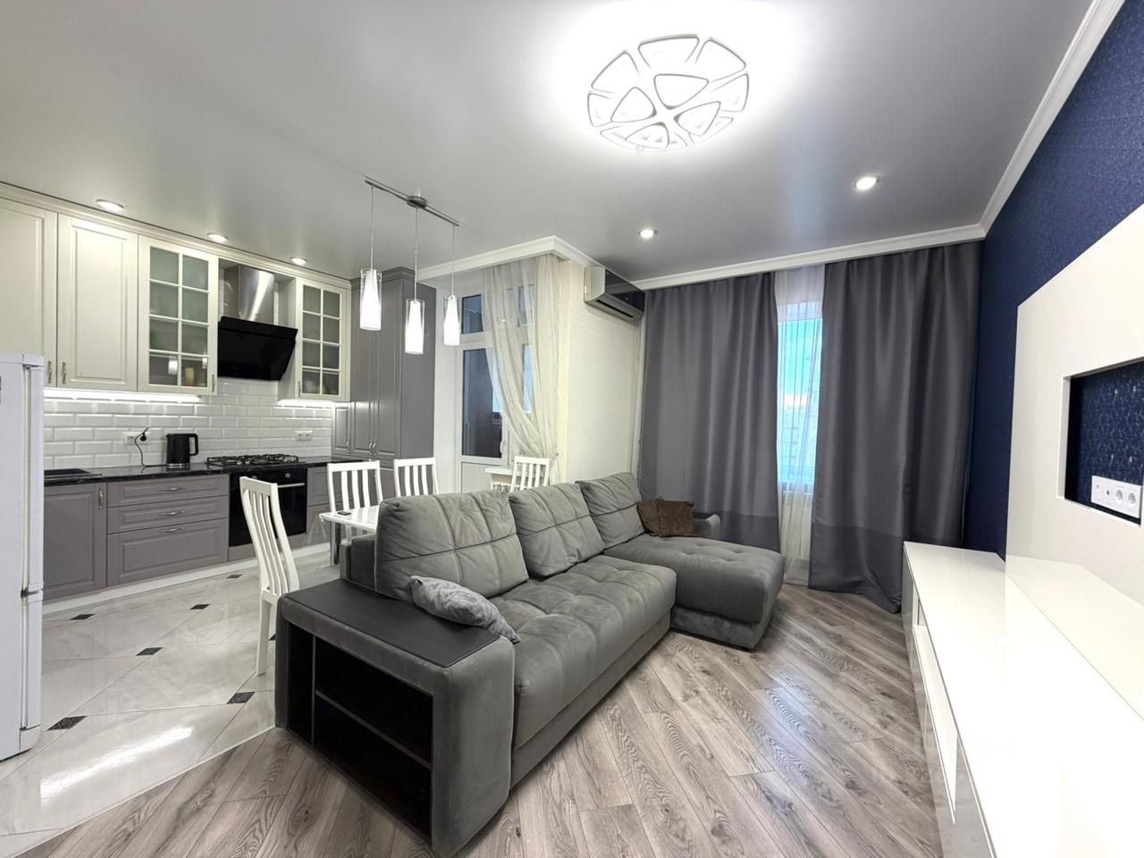 Квартира в отличном состоянии, сделан качественный ремонт с использованием дорогих материалов: итальянская плитка с фресками; обои бренда Trussardy; ванная Roca; тропический душ; смеситель и унитаз с инсталляцией Grohe. Шпонированные межкомнатные двери и шкаф в прихожей. Выполнена подсветка карнизов, кухни, тумбы под телевизор. На кухне установлен смеситель с встроенным фильтром для очистки воды. Для крепкого сна имеется большая и комфортная двухметровая кровать с матрасом АСКОНА.