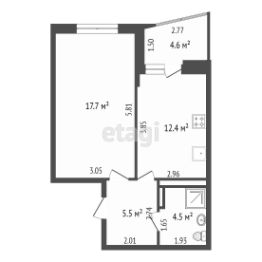 Планировка отличается продуманностью: выделенная кухня-гостиная 12.5 м² с панорамными окнами, отдельная жилая комната 18 м², совмещенный санузел и удобная гардеробная зона.