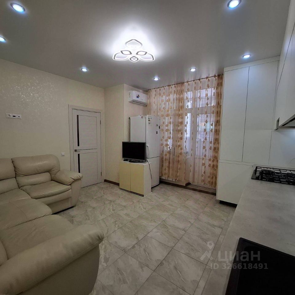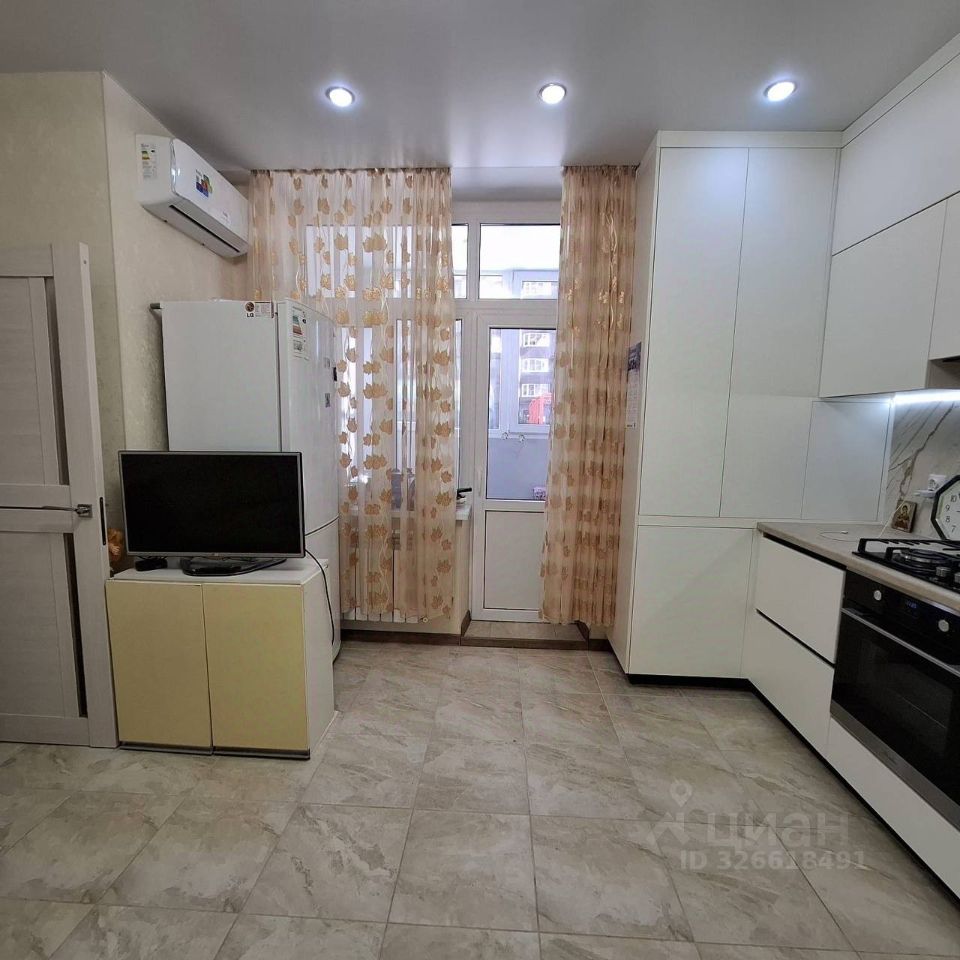 Кухня- гостинная с выходом на лоджию, огромный кожанный диван, кухонный гарнитур выполнен на заказ, посудомоечная машина, печь с духовкой, холодильник и кондиционер.