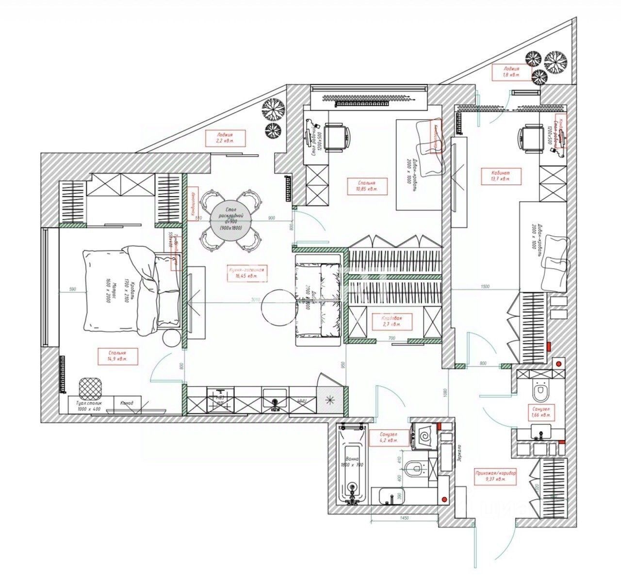 Шикарная планировка - 3 отдельные спальни, одна из них с гардеробной, кухня-гостиная с выходом на утепленную лоджию, 2 санузла, общая гардеробная.
