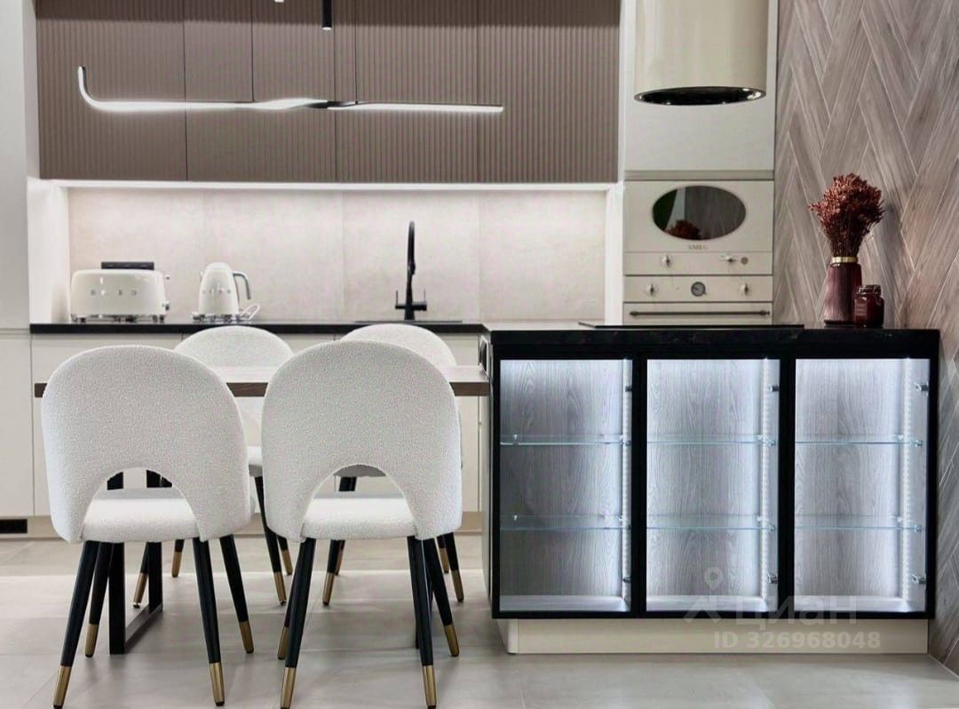 Стильная мебель, оборудованная кухня, современная бытовая техника.
