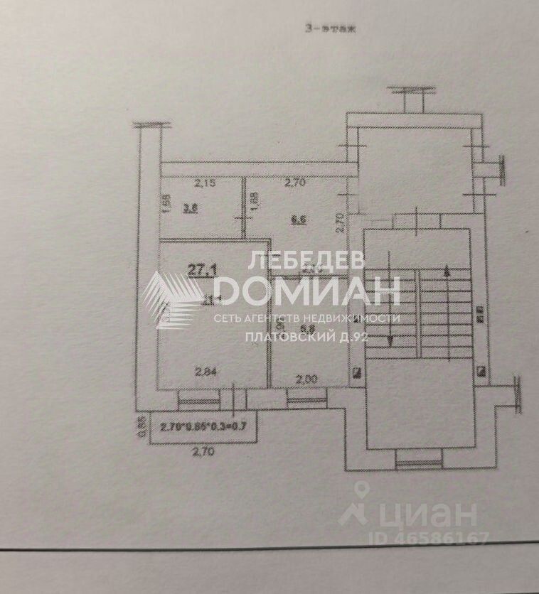 Общая площадь квартиры — 27,1 кв. м, из них жилая площадь — 11,1 кв. м, площадь кухни — 5,8 кв. м.