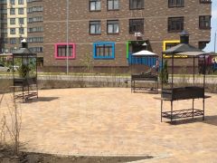 Пространство двора поделено на тематические зоны: среди зеленого ландшафта располагаются современные детские площадки и спортивные зоны, также мангальные зоны.